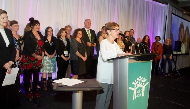 Lynne Raskin, CEO of South Riverdale Community Health Centre, speaks after accepting a Transformative Change Award for the centre's role in achieving government approval for Supervised Injection Services.