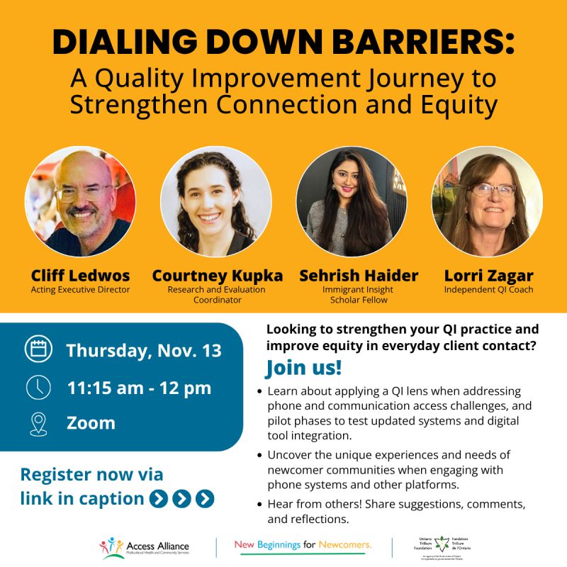 What’s the biggest barrier your clients face when trying to reach you by phone? Is it the system itself? Discover how Access Alliance is reshaping its phone system to cut wait times, improve language access, and embed equity into everyday client contact. Join us for 45-minutes of quality improvement (QI) methods, real-world data, and actionable next steps. We will share how QI leads, secretaries, and researchers came together with real-world data, plain-language scripts, and workflow analysis that make phone access an equity win for clients. Get practical ideas for integrating digital tools, tracking key indicators, and fostering cross-team collaboration to turn phone-related frustrations into reliable, inclusive client pathways. From "press zero" overloads to a strategic phone system redesign, hear about what we learned will boost client satisfaction and support community health goals.