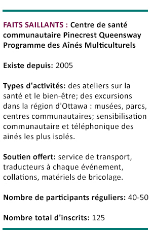 Pour les nouveaux arrivants en particulier, la possibilité de participer à des programmes qui améliorent la santé et le bien-être et qui promeuvent les relations sociales peut renforcer considérablement leur sentiment d’appartenance. Afin de surmonter les obstacles comme la maîtrise de la langue, la compréhension et la sécurité culturelle, et les expériences de racisme, des interprètes et des documents traduits comme des dépliants forment des éléments essentiels du programme multiculturel pour les aînés du CSC Pinecrest-Queensway. Et comme beaucoup d’aînés ne conduisent pas et ont des difficultés à circuler en transport en commun, encore une fois pour des raisons de langue, l’aide au transport est un autre facteur clé.
