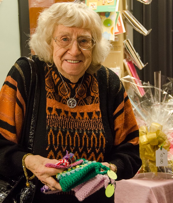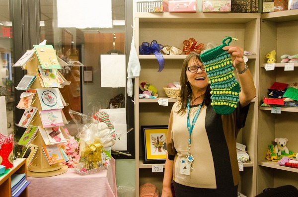 Gloria Ord holds one of the Stitch 'N Chat group's creations in the volunteer-run gift shop at Grand River CHC. (All photos: Oleksandra Budna/AOHC)