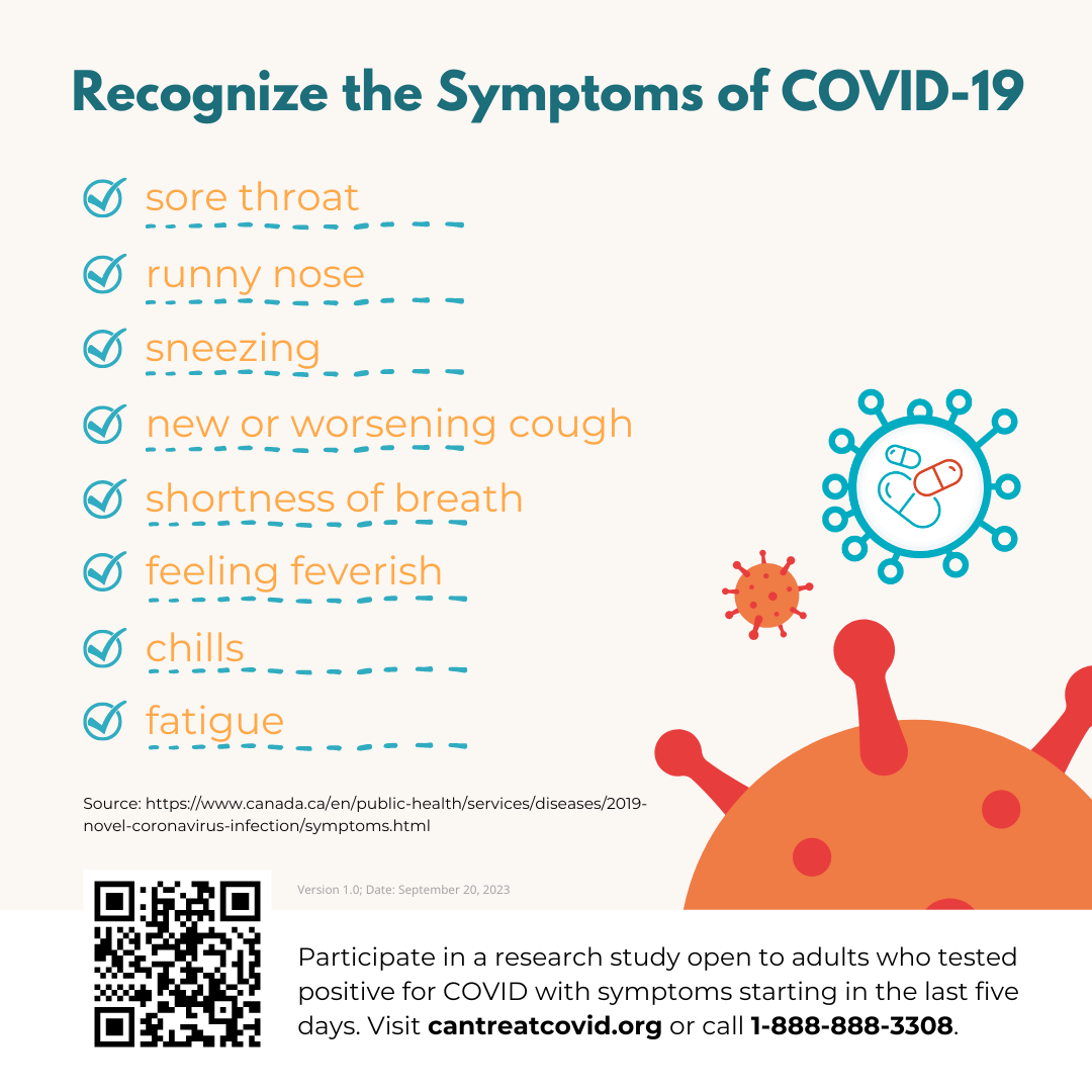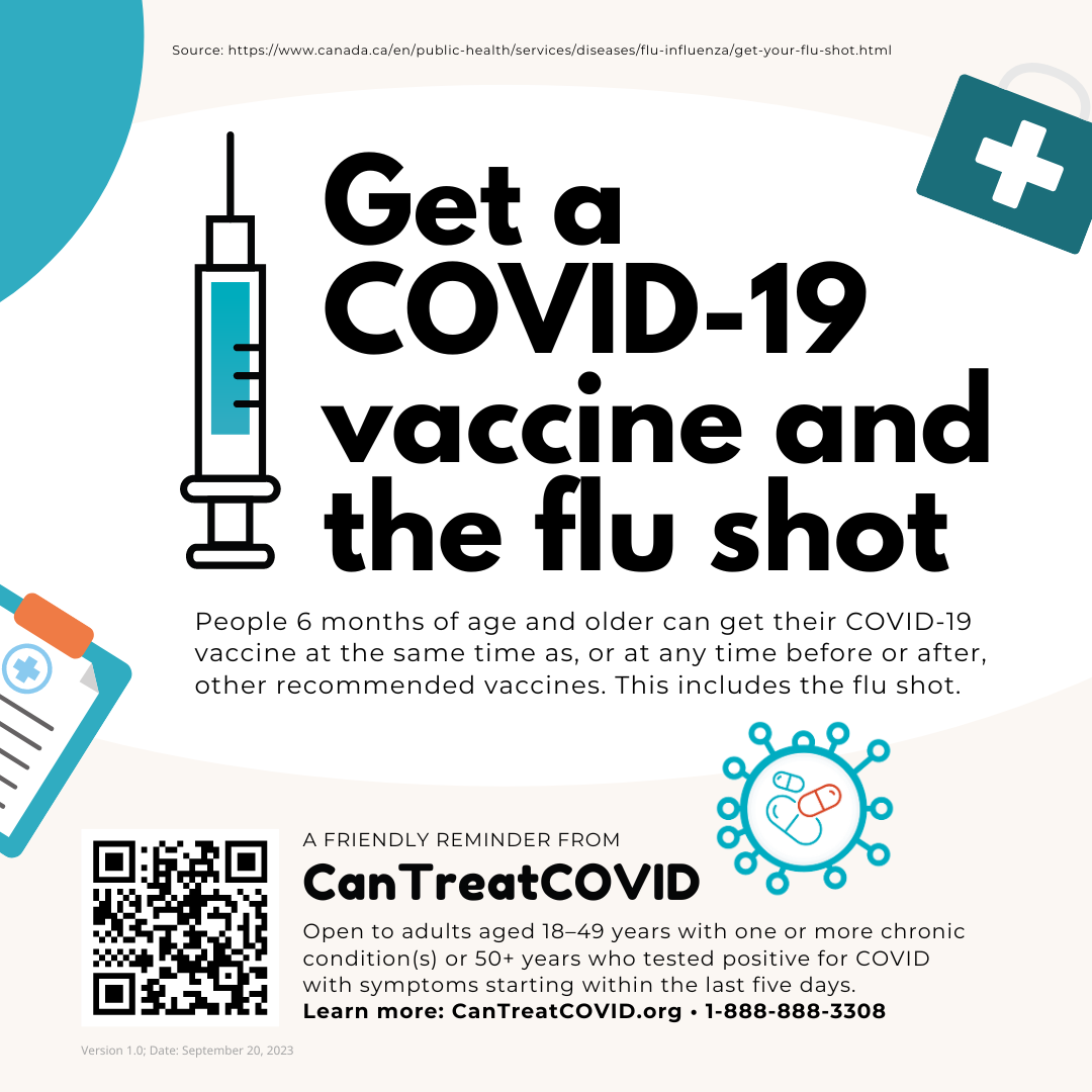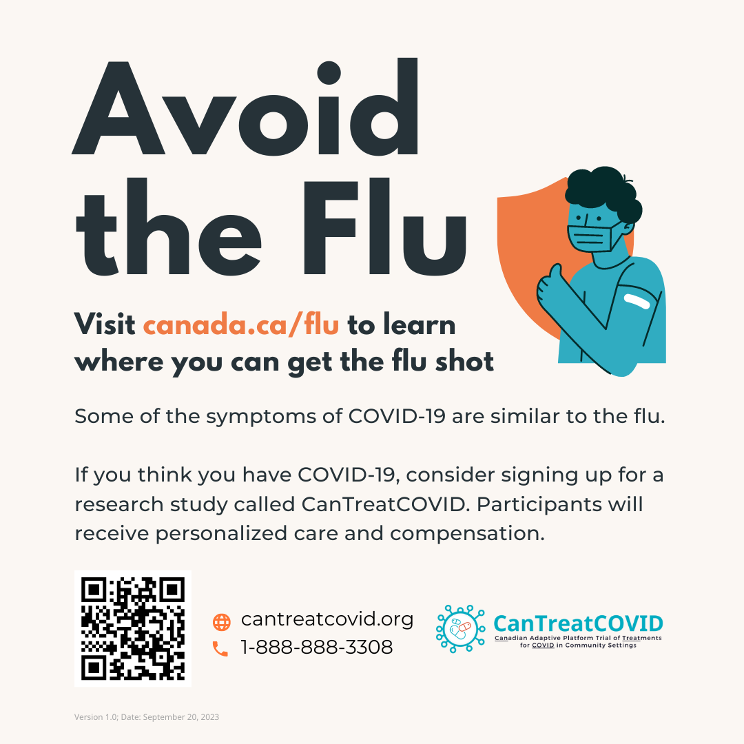 These five image (.png) files from the CanTreatCOVID study can be used as posters or social media cards. They contain health-promotion messages about COVID and flu testing, vaccination and symptom identification, as well as information about the study and how to enroll.